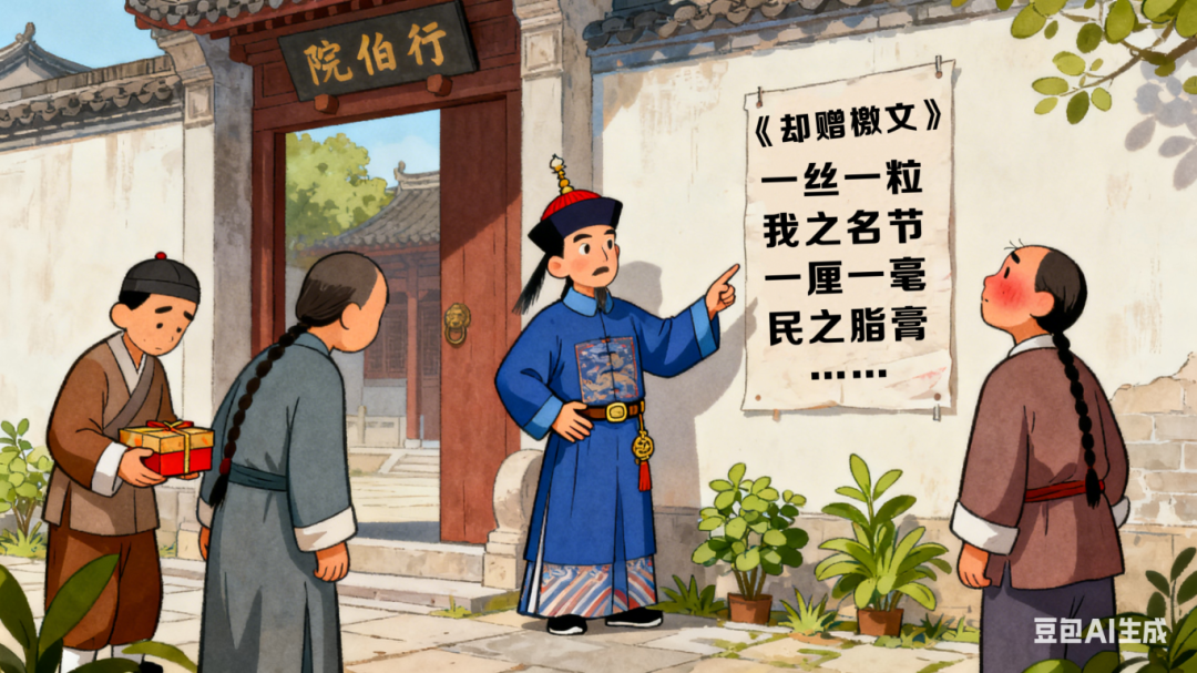 张伯行历任地方巡抚、六部侍郎和尚书,始终保持着高尚的官德。在担任江苏巡抚期间,为了杜绝送礼者向他行贿,他特撰写了一篇《却赠檄文》:“一丝一粒,我之名节;一厘一毫,民之脂膏。宽一分,民受赐不止一分;取一文,我为人不值一文。谁云交际之常,廉耻实伤;倘非不义之财,此物何来?”该文全篇56字,共用了8个“一”字,表达了他关心百姓疾苦、注重个人名节、反对送礼行贿的主张。张伯行将这篇《却赠檄文》张贴于自己居所的院门以及巡抚衙门前,前来送礼行贿的人一读此文,便不再敢自讨没趣,只能默默离开。张伯行为官不仅不收贿赂,甚至连衣食等日常花销也不动用公家财产。他曾上疏道:“臣虽历官巡抚,而服食、起居未脱寒酸故态。”