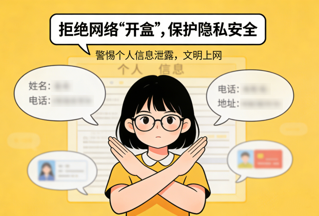 坚守法律底线,不泄露、不买卖、不传播他人个人信息,坚决不参与网络“开盒”,不被他人煽动参与网络暴力,做文明守法网民。