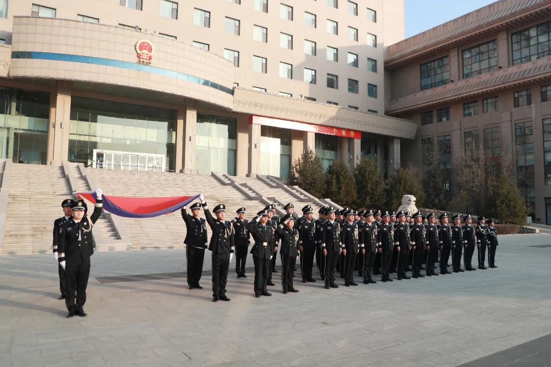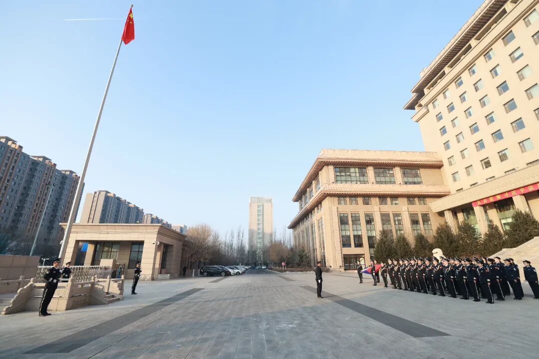 升国旗仪式。国旗下,一支列队整齐、训练有素的司法警察队伍肃立注目,庄重地向国旗敬礼,寒风凛冽也丝毫抵挡不住他们如火的热情。此刻,忠诚与使命汇聚于心,万千言语都不及他们眼中的一道道深情。