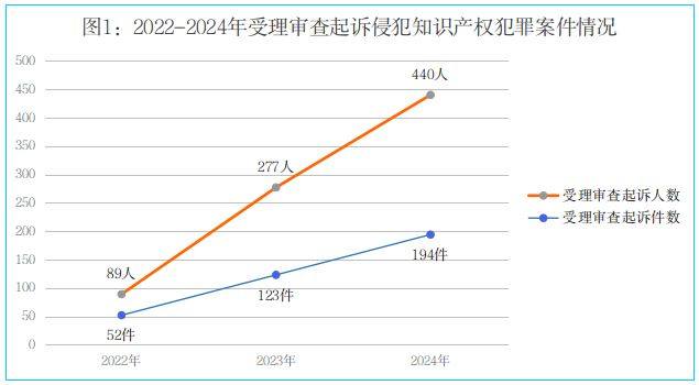 2022至2024年,全区检察机关受理审查逮捕侵犯知识产权犯罪案件分别为20件24人、53件100人、69件104人;受理审查起诉案件分别为52件89人、123件277人、194件440人。总体来看,侵犯知识产权犯罪案件数量呈上升趋势,检察机关打击力度持续加大。