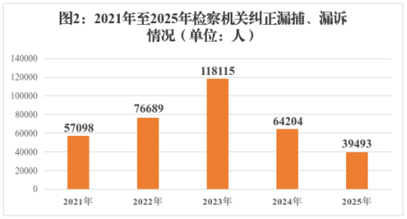 1. 立案监督和侦查活动监督更加注重提升质效。全国检察机关立案监督6.4万件,同比下降34.6%,其中,对应立不立的监督立案1.7万件、不应立而立的监督撤案4.4万件,建议行政机关移送刑事案件3238件。纠正漏捕、漏诉39493人,同比下降38.5%(见图2)。针对侦查活动制发纠正违法通知书8.1万件、侦查活动监督通知书14.4万件、检察建议6157件,上述三类数据总数同比下降28.5%,侦查活动违法监督意见采纳率95.6%。监督行政机关移送刑事案件同比上升9.2%。