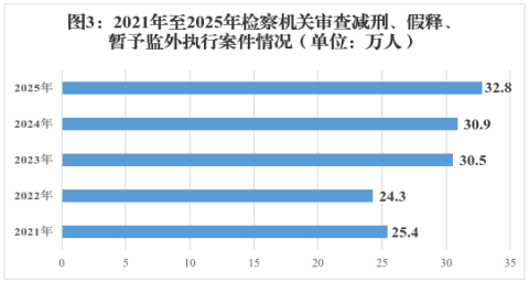 3. 刑事执行监督保持较高质量。全国检察机关受理审查减刑、假释、暂予监外执行案件328276人(见图3),提出书面纠正违法3216人、检察建议3153人。针对刑罚执行和监管活动提出监督意见45861件。针对监外执行监管活动提出监督意见41249人。针对财产性判项执行提出监督意见3.1万件。针对监狱、看守所分别开展巡回检察580次、1255次。