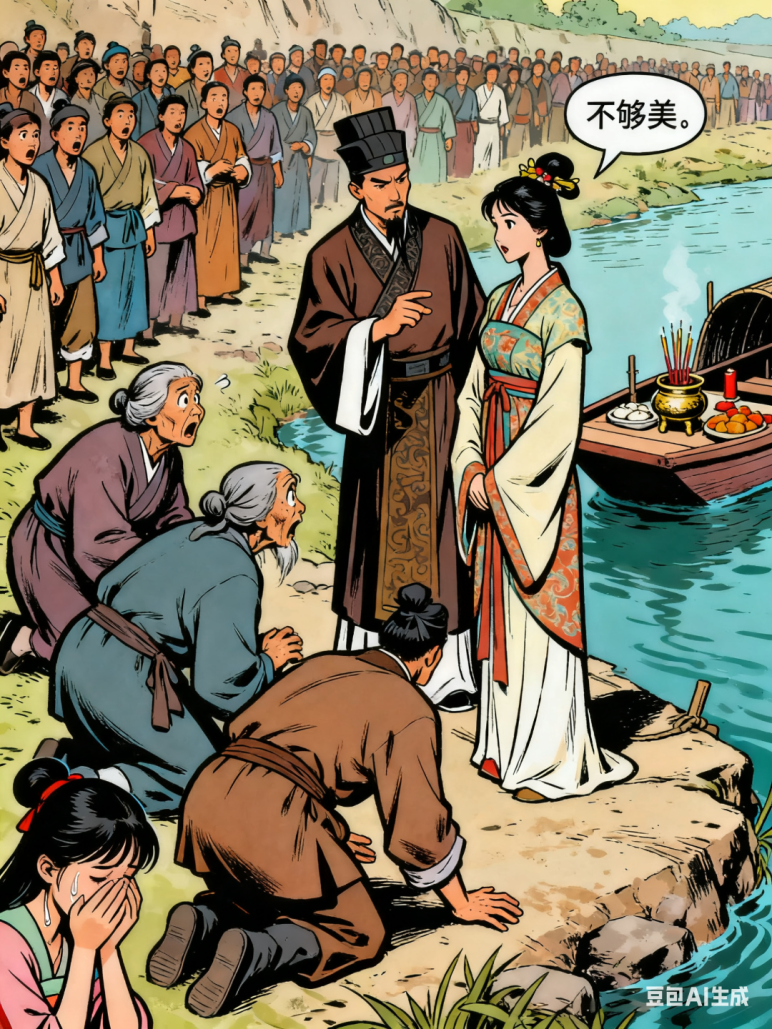 西门豹到任后,首要解决的便是“河伯娶妇”的积弊。当地巫祝与地方官吏相互勾结,以祭祀河神为名,每年挑选少女投入河中“献祭”,同时强征重税搜刮钱财,导致百姓贫困流离,许多家庭为避祸纷纷逃亡。西门豹洞悉其奸,却假意配合祭祀仪式。在祭祀现场,他以“新娘不够美”为由,先后将巫婆、巫婆弟子及地方长老投入河中,当场戳穿骗局,震慑了腐败势力,彻底废除了这一陋习。