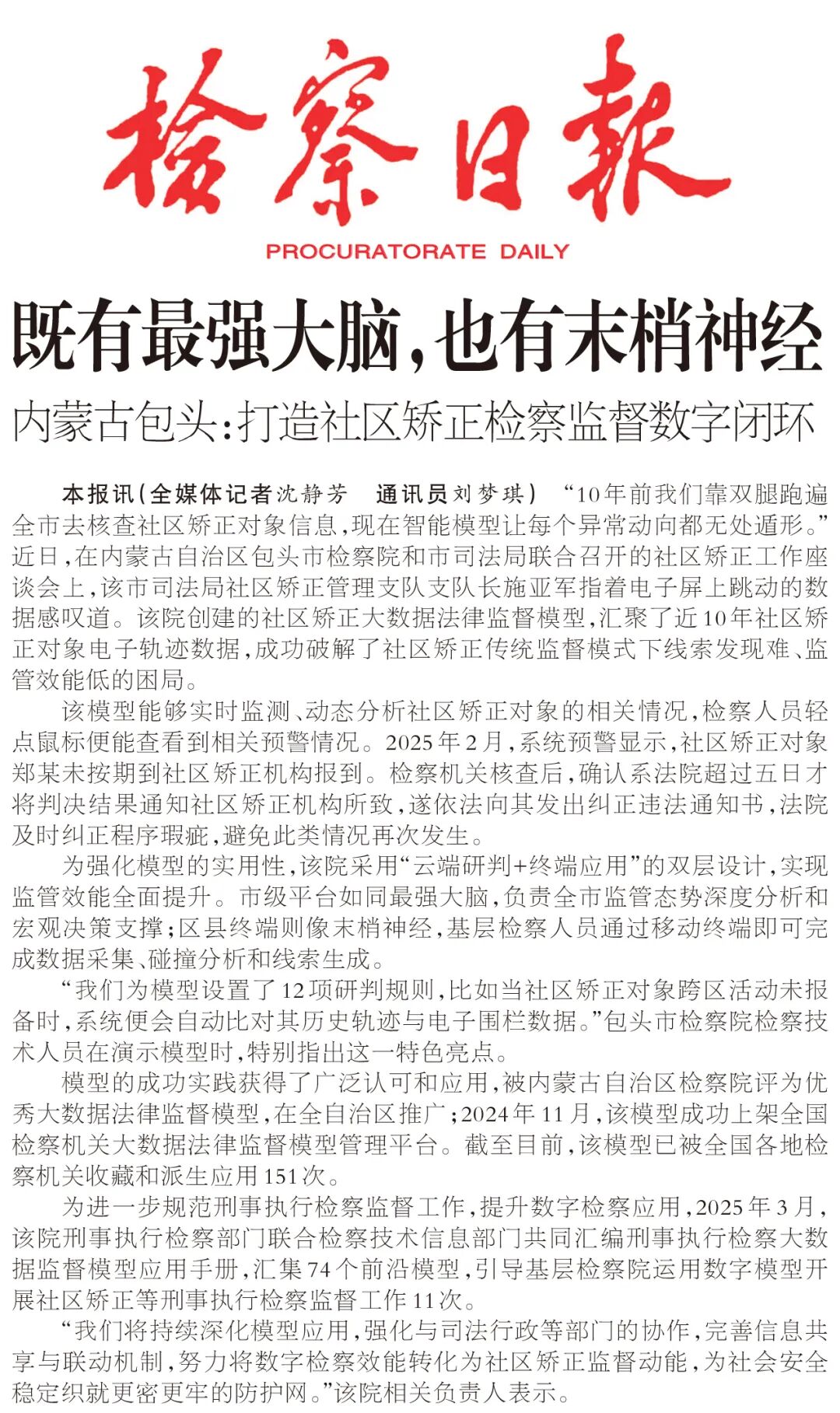 “10年前我们靠双腿跑遍全市去核查社区矫正对象信息,现在智能模型让每个异常动向都无处遁形。”近日,在内蒙古自治区包头市检察院和市司法局联合召开的社区矫正工作座谈会上,该市司法局社区矫正管理支队支队长施亚军指着电子屏上跳动的数据感叹道。该院创建的社区矫正大数据法律监督模型,汇聚了近10年社区矫正对象电子轨迹数据,成功破解了社区矫正传统监督模式下线索发现难、监管效能低的困局。