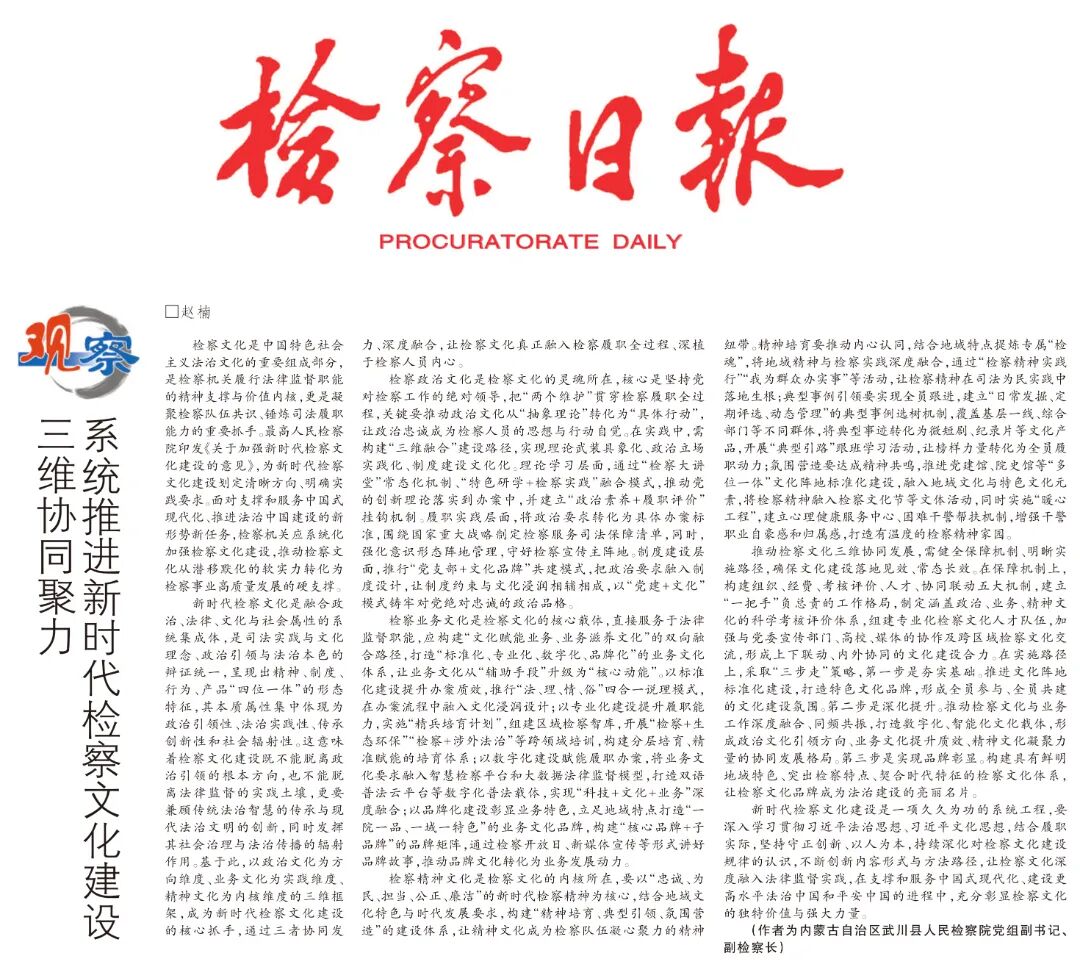 检察文化是中国特色社会主义法治文化的重要组成部分,是检察机关履行法律监督职能的精神支撑与价值内核,更是凝聚检察队伍共识、锤炼司法履职能力的重要抓手。最高人民检察院印发《关于加强新时代检察文化建设的意见》,为新时代检察文化建设划定清晰方向、明确实践要求。面对支撑和服务中国式现代化、推进法治中国建设的新形势新任务,检察机关应系统化加强检察文化建设,推动检察文化从潜移默化的软实力转化为检察事业高质量发展的硬支撑。