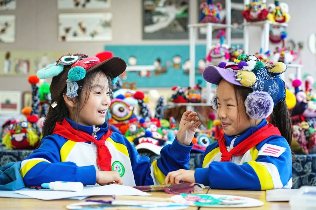 10月22日,山东省淄博市博山区四十亩地小学学生头戴自己创作的布贴画头饰。近年来,该区积极开展非遗进校园活动。目前,当地已成功引进非遗项目18项,13所学校在校本课程开发中融入非遗元素,通过课程化设计实现非遗的常态化传承,推动非遗教育与日常教学的有机结合。 新华社记者朱峥摄