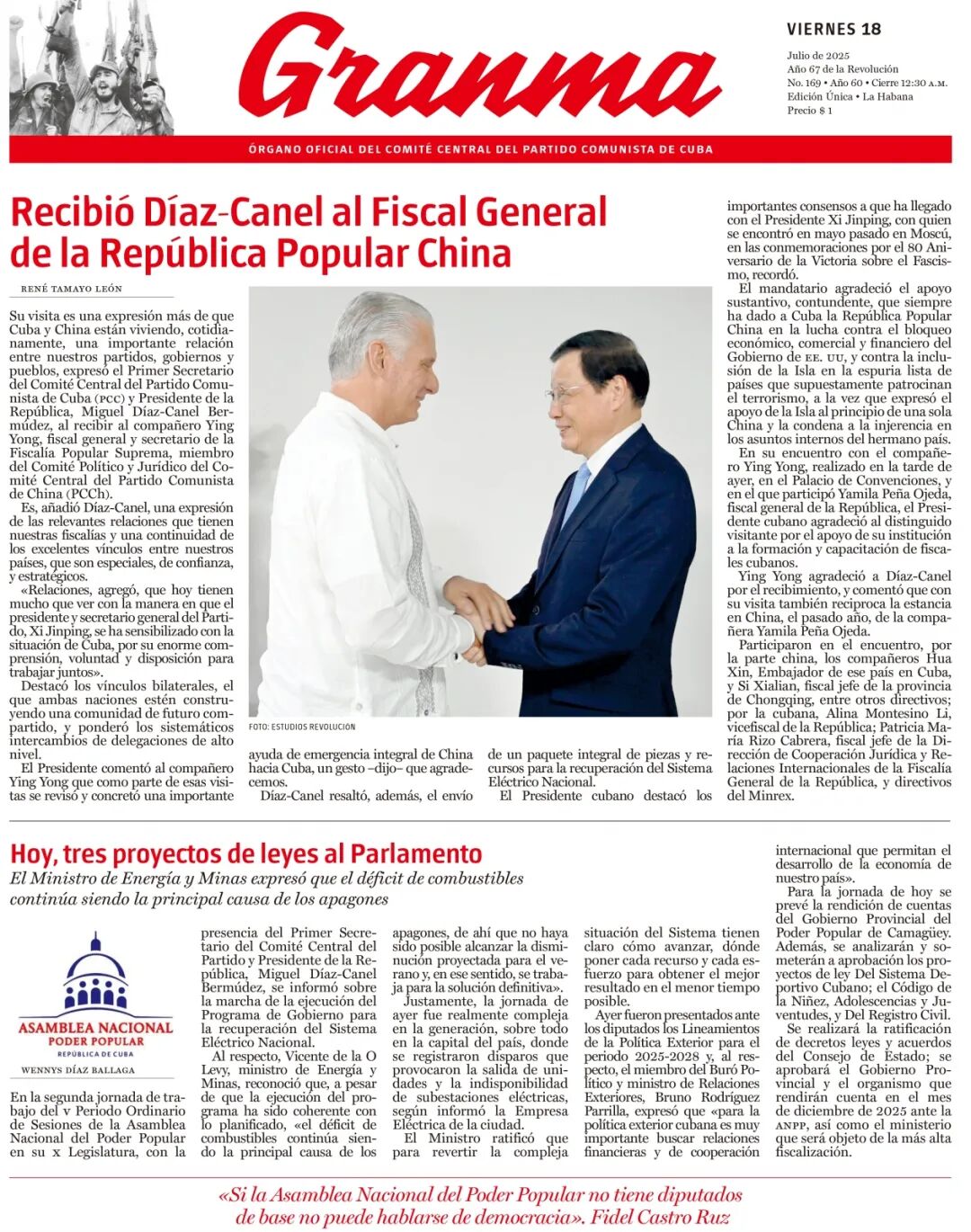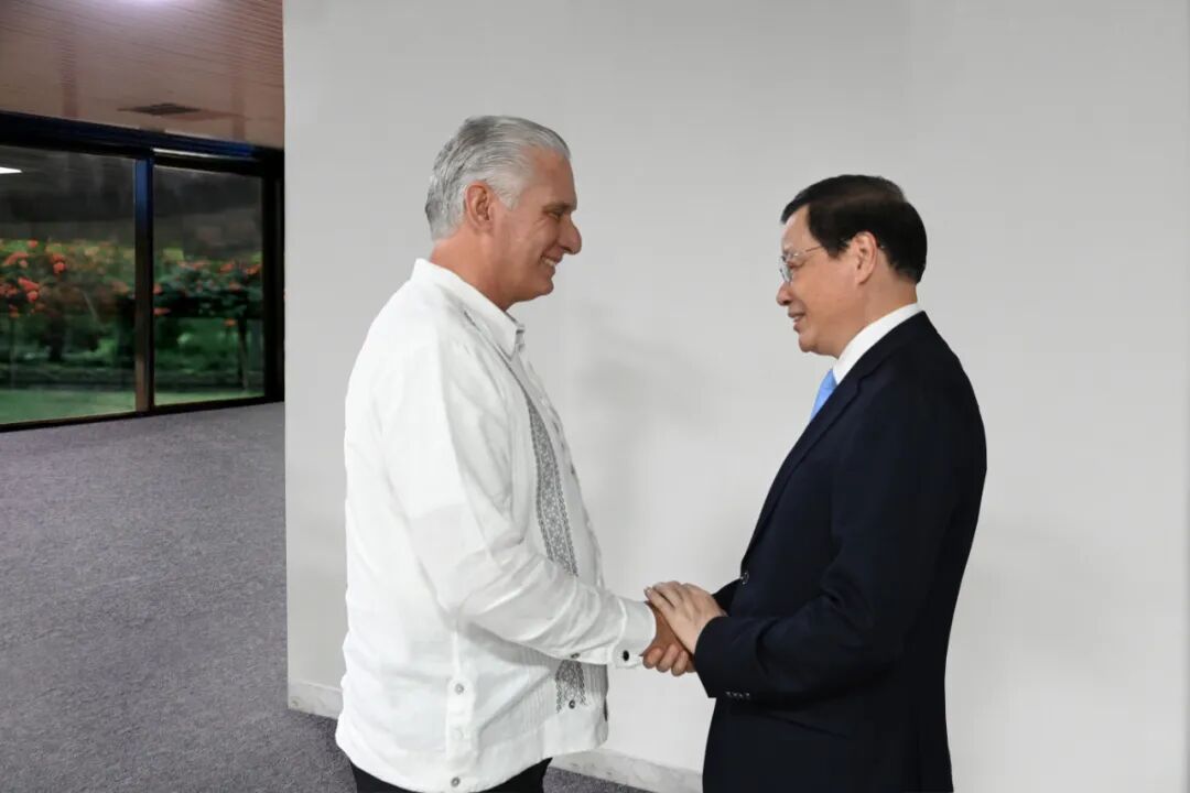 当地时间7月17日,古共中央第一书记、古巴国家主席迪亚斯-卡内尔在哈瓦那会见率中国检察代表团访古的中国首席大检察官、最高人民检察院检察长应勇。