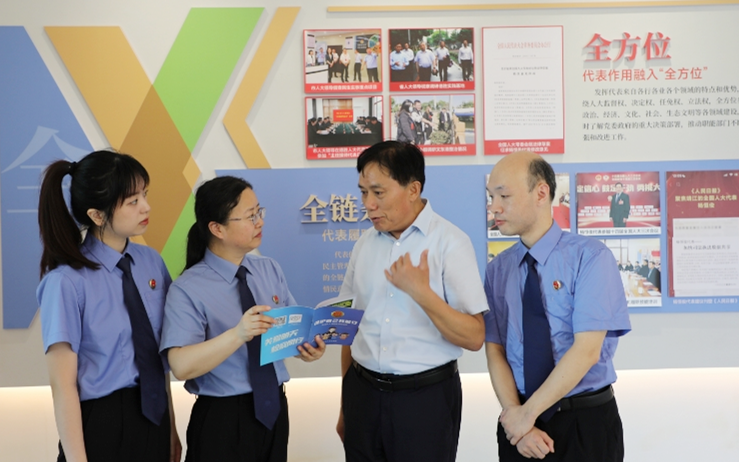 江苏省靖江市检察院检察官来到德胜中心村向杨恒俊代表(右二)通报未成年人检察工作。